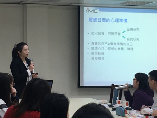 本校生涯發展中心近期舉辦系列企業徵才說明會,108年3月15日由IMC 精英人力資源公司招募經理江瑩為本校學生介紹求職的詳情。IMC 精英人力資源已成立28年,服務據點擴及全臺,主要服務項目為協助國內外企業徵才;主講人江瑩,留學日本期間與當地職場接軌,曾任職於迪士尼大使飯店,具有日商企業的豐富資歷。