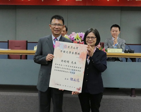 中文系鍾正道主任隨即公布本屆「2019東吳大學中文系全球徵聯活動」前三名得主,第一名為許瀞元女士「九州分野時興時衰時兼併」;第二名為侯易佃先生「一中各表可爭可談可相助」;第三名為許舒閔小姐「三權分立兼衡兼容兼相輔」,由馬英九前總統頒發第一名獎項,潘維大校長頒發第二、三名獎項。頒獎儀式後,請馬前總統公布下屆全球徵聯活動之上聯「周亡鼎秦失鹿問鼎逐鹿不謀私利」。