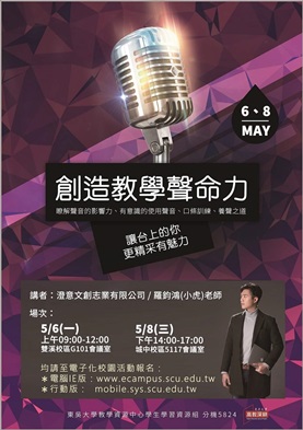 你是否對自己的說話方式感到不滿意?本校教學資源中心5月9日於城中校區舉辦「創造教學聲命力」講座,邀請聲語表達訓練師羅鈞鴻老師,與現場的師生們分享學習聲音訓練的經驗,並教導大家如何進行聲音訓練。