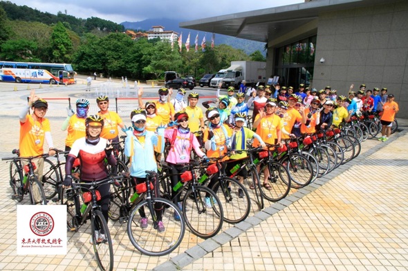 在領隊會計系李坤璋主任(會計系83級)的帶領下,校友們更在本次泳渡活動中完成了另一項創舉:單車環潭。8月31日下午,38位校友挑戰總計30公里,蜿蜒狹窄的環潭公路;在遊覽車及汽車貼身呼嘯而過之下,大家無不全神貫注,緊握手把,腳踩踏板,從大臂的二頭肌、腹部的核心肌群到小腿肌肉,全神貫注;在爬過玄奘寺、登上玄光寺後,經過將近4小時的自我挑戰,環潭隊伍終於抵達「向山遊客服務中心」,在仿蘭陽博物館的服務中心前,合影留念,為各自的生命歷程,留下值得驕傲的一頁。