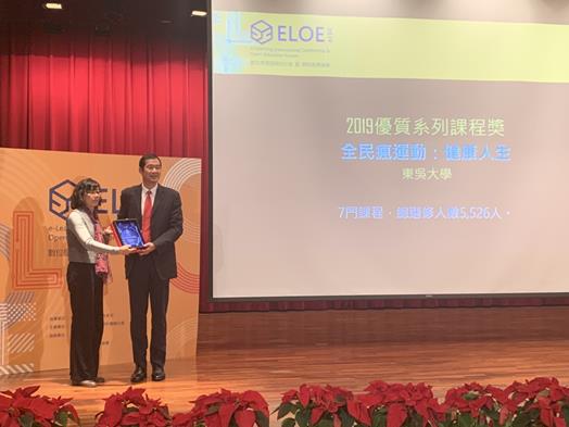「 2019數位學習國際研討會暨開放教育論壇」108年12月20日假國立宜蘭大學萬斌廳舉行頒獎儀式,由教育部數位學習深耕計畫辦公室,自全國大專院校執行108年數位學習計畫中,評選出成效優良的學校,本校由體育室東方介德主任所主導的「全民瘋運動:健康人生」課程,獲選為2019年數位學習執行成效優良之課程,榮獲「2019優質系列課程獎」,頒獎典禮由東方主任代表出席及受獎。
