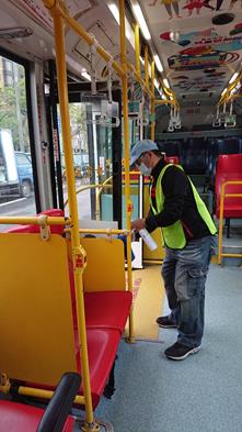 依台北市公共運輸處規定,公車內應每8小時應消毒一次,中興巴士557公車已配合本校需求於每4小時進行內部消毒,但因師生搭乘557公車頻繁且人數密集,而中興巴士亦無人力增加消毒之頻率,故自3月23日起由本校環安衛暨事務組每日派員,從7:00至17:00駐點在557公車士林總站進行車內消毒。工作人員會在公車出車前完成車廂內座椅、扶手、扶桿、拉環、下車鈴及刷卡機周邊等接觸面之消毒,並記錄車號、消毒時間,除方便查考外,增加消毒頻率以降低感染機會,也讓師生安心搭乘。