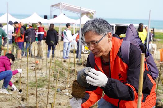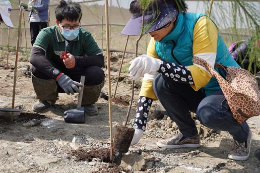 活動當日艷陽高照,海風強勁,但到場校友無畏氣候挑戰,依舊辛勤掘土、施肥和回填,每一步驟都小心翼翼,心裡知道每棵樹苗都像是孩子般需要細心呵護,才能成長茁壯。校友總會也為每位認養小樹的校友製作樹牌,樹牌上記錄著認養人的姓名,讓校友們有空時能回到海岸關懷自己小樹的成長狀況,校友們植樹時也不忘協助未能到場的學長姐們,將他們的樹牌一同掛上小樹。種下樹苗、繫上樹牌的剎那,大家臉上的笑容就像當日天氣一樣晴朗溫暖。