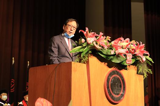 潘維大校長勉勵畢業生,凡事要心存敬畏、謙卑的學習及擁有感恩的心才能走得遠、走得穩,因為疫情讓我們感受人事變化無常,而任何事情都不會是理所當然如自己所想像的發展,因此要特別珍惜當下所擁有的。王紹堉董事長代表董事會祝福全體師生及畢業生健康平安,校友總會劉吉人理事長則表示,工作儘管忙碌,但每年迎接新生和畢業典禮,都成為他行事曆上的重要事項,今年畢業典禮雖然受到疫情影響,但通訊科技仍使我們能進行緊密溝通聯繫,而今日畢業不是道別,而是開展人生中另一個挑戰的開始,校友總會歡迎大家加入東吳校友大家庭。