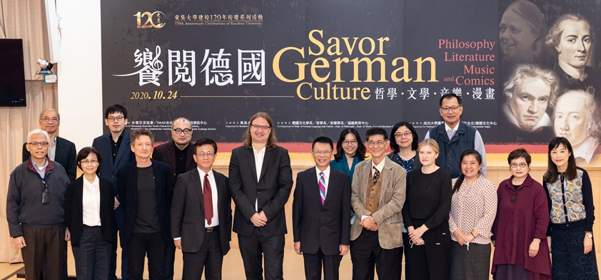在涼爽宜人的秋日時節,約百位師生同仁在東吳校園內享受了一場豐盛的德國文化饗宴。由圖書館舉辦的「饗閱德國:哲學·文學·音樂·漫畫」活動,109年10月24日上午9時於普仁堂、戴氏基金會會議室熱鬧舉行。當日,亦為德國圖書館日,意義更具深遠。
