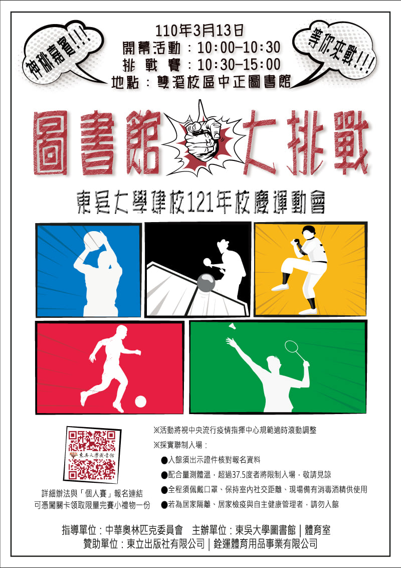 圖書館與體育室於校慶當日在外雙溪校區圖書館舉辦「漫遊奧運在東吳」系列活動,共同歡慶校慶,以「前進東京,奧運奪金!中華健兒,東吳挺你!」為發想起點,結合漫畫、遨遊奧運競技主題的概念,並透過輕鬆、簡易的方式,讓參與者在閱讀的同時,也能瞭解運動相關知識與奧義。