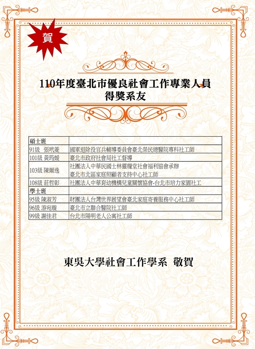 臺北市政府於110年3月26日在臺北凱撒大飯店舉辦「110年度臺北市社工專業角色發展研討會暨優良社工人員表揚」活動,表揚優良社會工作專業人員表揚42位得獎者,計有本系張玳菱(81級)、陳淑芳(95級)、游宛璇(96級)、謝佳君(99級)、黃筠媛(101級)、陳爾逸(103級)、莊哲彰(108級),共計7位系友獲獎,恭喜本系系友表現深受肯定!