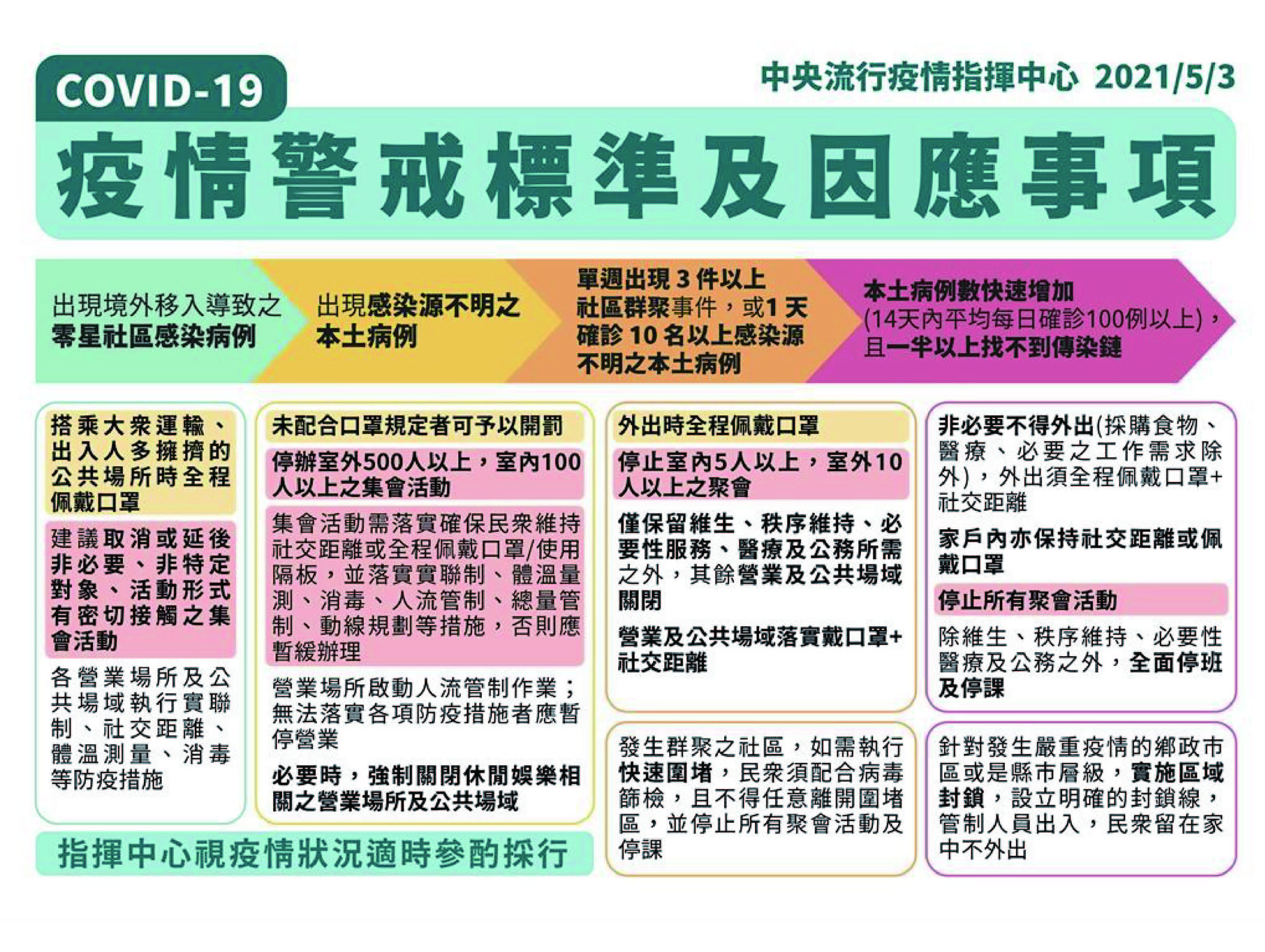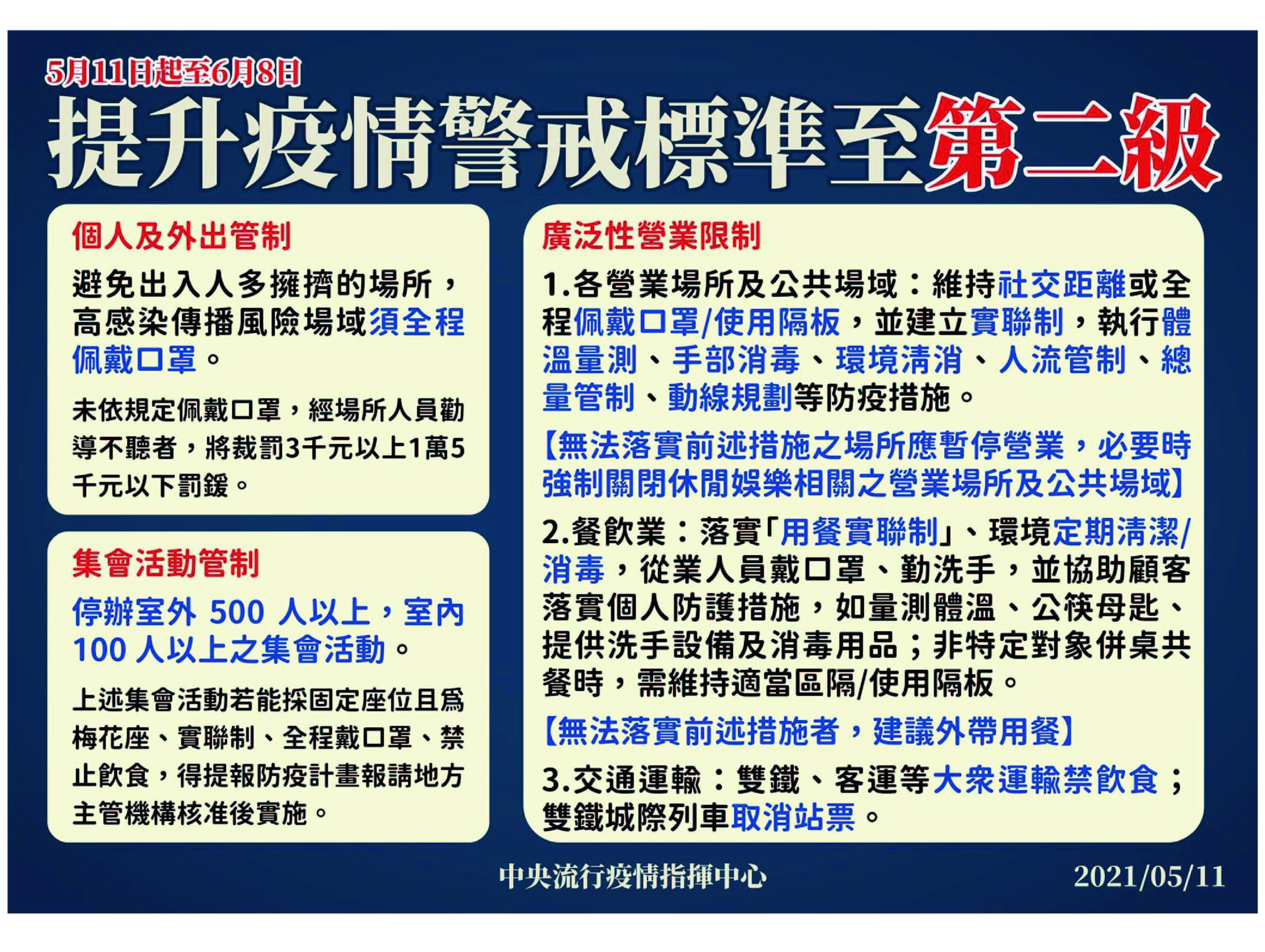中央流行疫情指揮中心(今)5月11日宣布,國內出現「感染源不明」本土病例讓社區感染的風險增加,因此宣布即日起到6月8日,將疫情警戒提升到第二級。請本校各位師生同仁,也需謹守防疫規範,保護自己也保護他人!