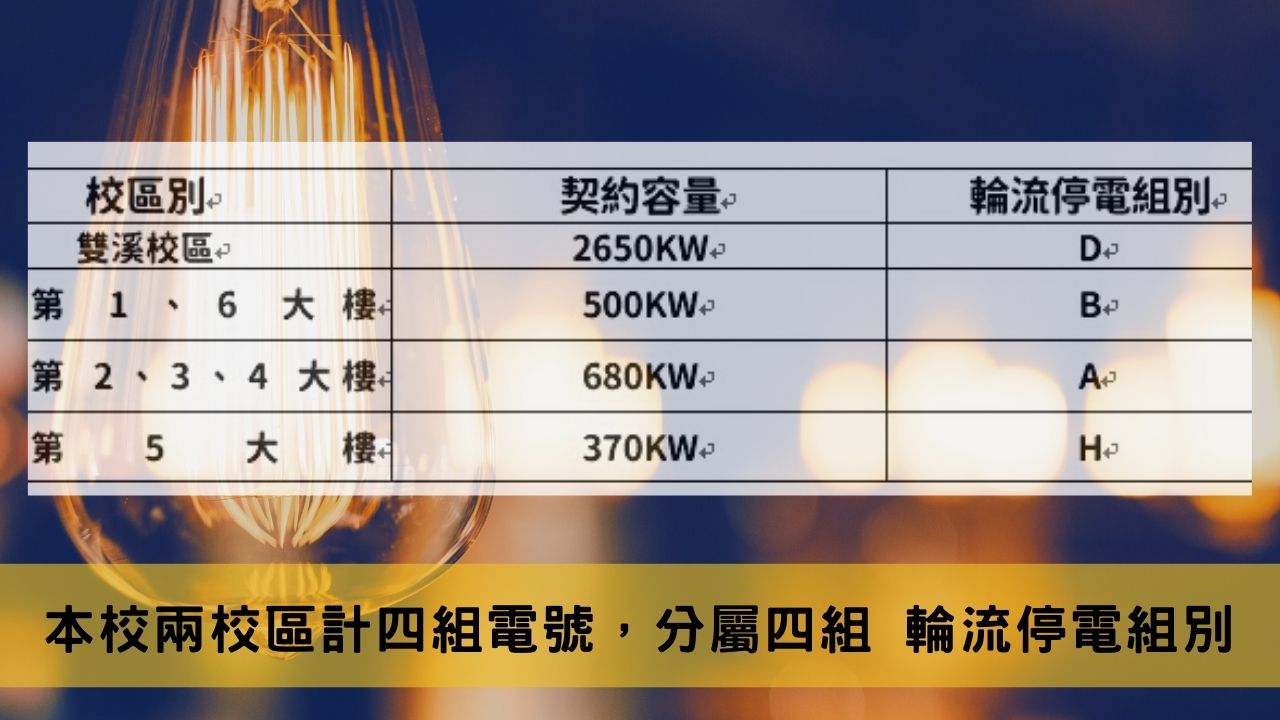 台電興達電廠於110年5月13日因事故全場停機,全台用電戶下午3時起按照輪流停電組別C、D組展開分區輪流限電(本校兩校區共分四組電號,分屬A、B、D、H輪流停電組別),至夜間全面恢復正常供電前,兩校區皆正常供電,不受停電影響。