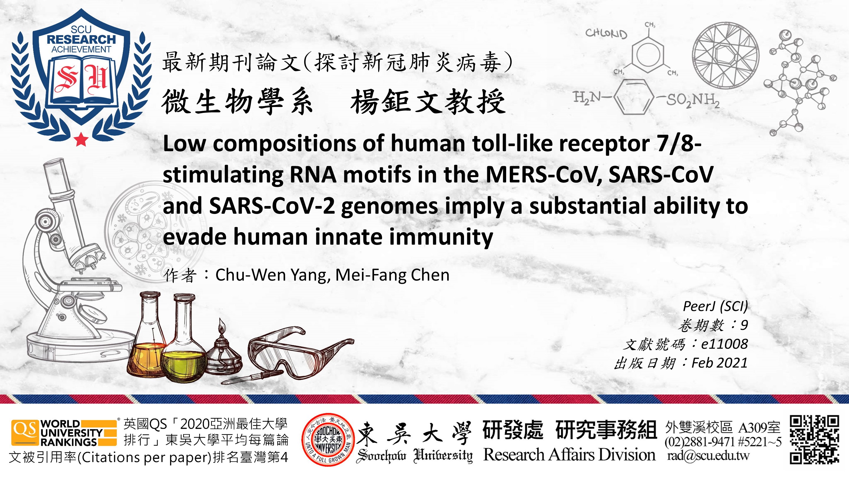 本論文比較新冠肺炎病毒與普通冠狀病毒基因體核甘酸組成的差異,探討不同病毒對躲避宿主先天免疫系統能力不同。本文是東吳第三篇新冠病毒的研究論文。