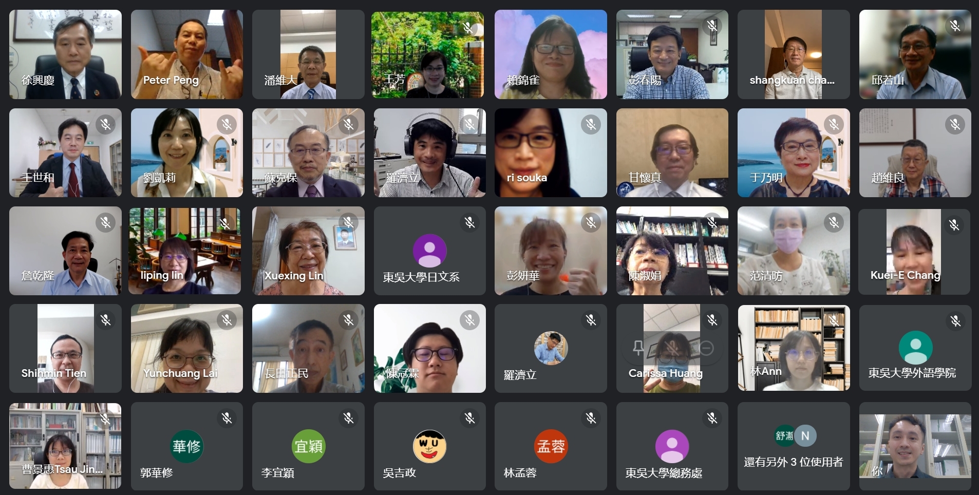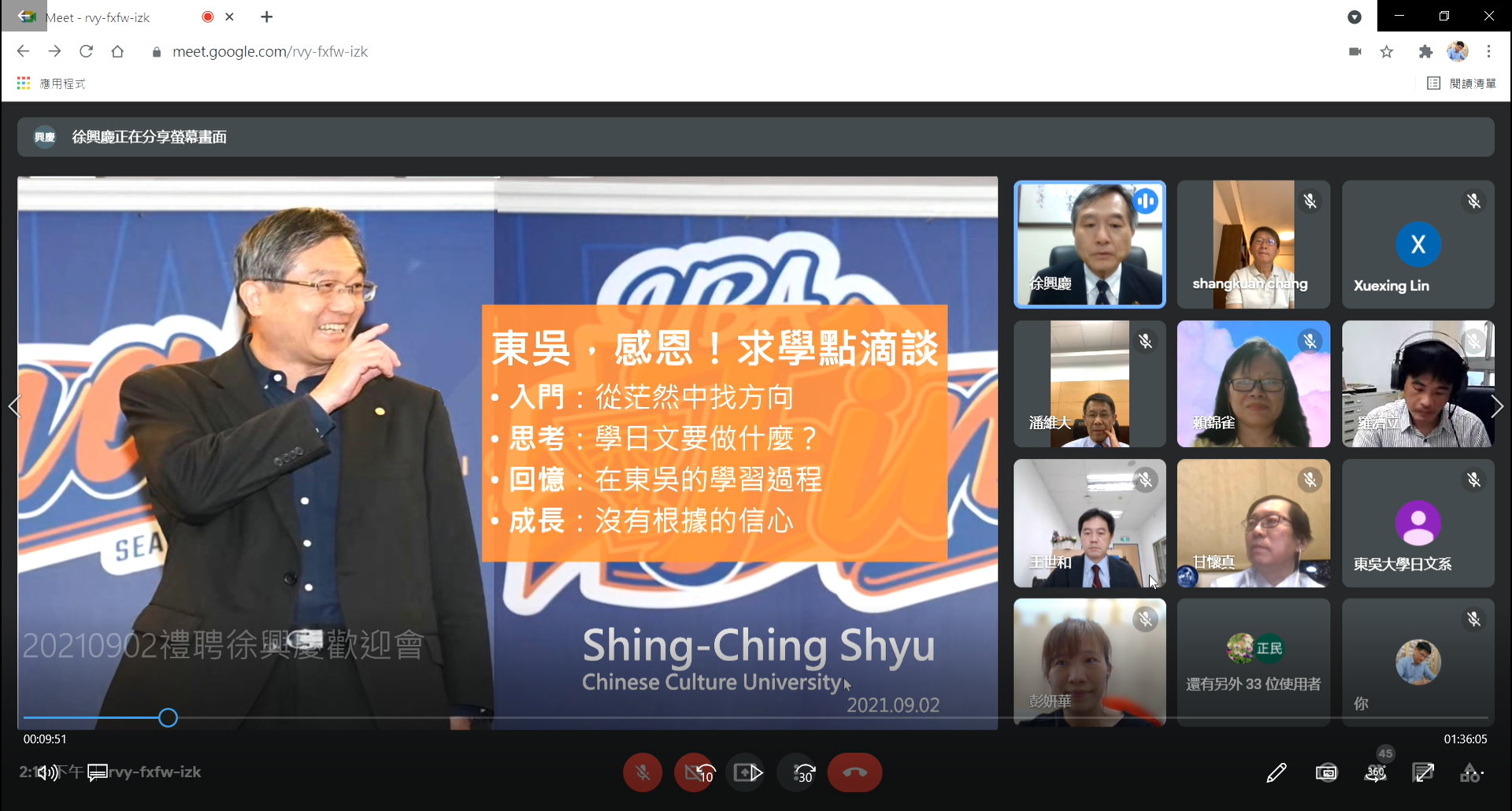 本校於110學年度禮聘文化大學徐興慶校長擔任「東吳大學端木愷校長(字鑄秋)講座教授」,日本語文學系特於110年9月2日(四)下午舉辦禮聘線上歡迎會。歡迎會當日有將近五十位師長出席致意,包含本校潘維大校長,趙維良副校長、詹乾隆教務長、王淑芳社會資源長、英文學系張上冠講座教授、日本語文學系賴錦雀特聘教授、外語學院王世和院長、圖書館李宗禾館長,以及外國語文學院各單位師長、政治大學前教務長于乃明教授、臺灣大學歷史系甘懷真教授、臺灣大學日本語文學系兼日本研究中心主任林立萍教授、臺灣大學日本語文學系田世民教授、淡江大學日本語文學系兼校友服務暨資源發展處執行長彭春陽教授、靜宜大學日本語文學系邱若山主任、文化大學日本語文學系兼國際處東亞組組長林孟蓉副教授等。