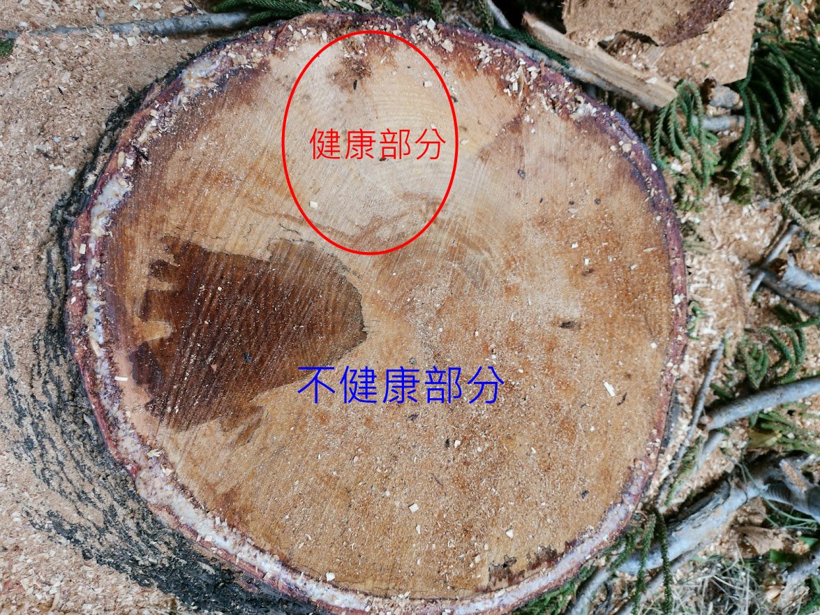 圖二: 超庸館肯氏南洋杉病樹移除後莖基部橫切面-健康部分僅佔全部1/7