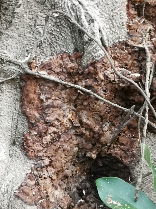 圖三: 榕華樓榕樹群莖基部表面深褐色至黑褐色菌絲面