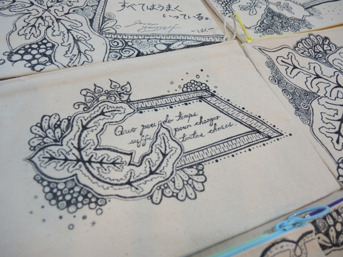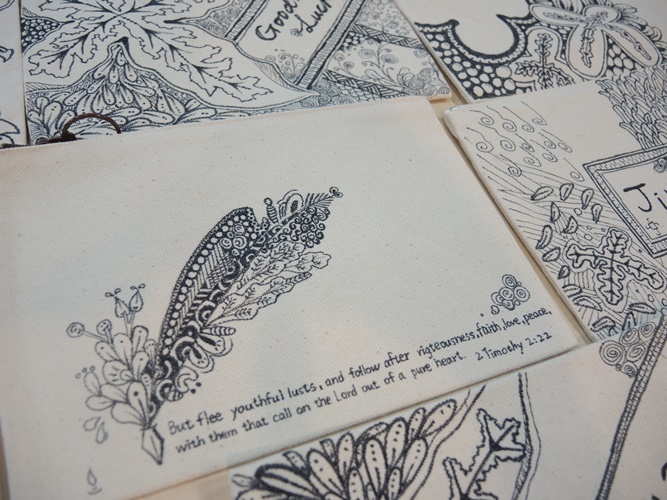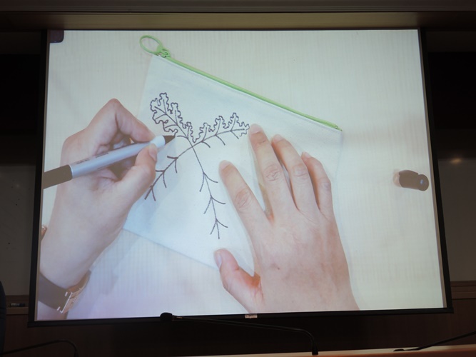 創作的最後,講師也鼓勵各位同學享受並擁抱自己的不完美。繪畫過程中因布料的凹凸不平產生的飛白,正如同一般生活中少見的機緣。所謂飛白,又可稱之為「飛白書」,是一種書法手法。這種書法筆畫中絲絲露白,並不如一般我們熟知的楷行隸書一樣完美無瑕。可是,這樣被視為瑕疵的露白,在飛白體裡,反而成為它的特色。這次禪繞藝術的創作媒材為帆布袋,因布料較為凹凸,一筆劃上去容易會有飛白的產生。因而老師鼓勵大家,不用把它當成失敗品,而是專屬於自己的特色,與其將它視為失誤,不如把它看成一種驚喜、一種成長。圖騰都起源自纖細的苗,但在創作的過程中會持續的擴張、茁壯。正如同大學階段的學子,懷著期待踏入人生的新階段,雖然現在還未成熟,但一定會隨著時間不斷蛻變、有所成長。