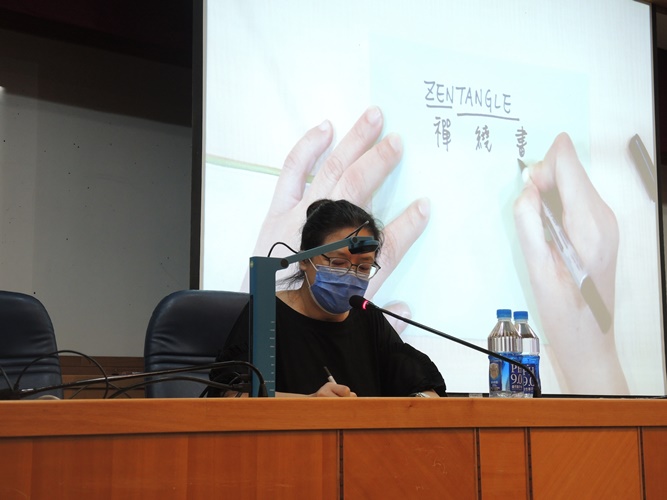 禪繞畫(Zentangle)是由美國引進的藝術型態,其圖騰看似多變,實則可以解構成五元素線條,分別為點、直線、弧線、曲線和球體,只要透過這五項元素便可以完成官方的近200種圖樣,變化萬千。創作前講師帶領同學們做數字操,理解在0~9之間所運用到的線條。元素線條在日常生活中無所不在,線條的使用並沒有大家想像中困難,只要願意拿起筆,就可以畫圖。