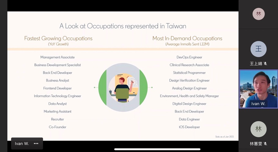 Ivan分享自身求職經歷,他過去三份工作都是透過LinkedIn作為媒介,最後,他肯定台灣人才濟濟,國際市場上對台灣求職者也是供不應求,鼓勵不論是對國外工作有興趣或是在求學期間想找實習工作的同學,使用一個不受時空與地域限制,能創造求職機會的數位平台,可減少在職涯探索路上的疑慮徬徨。