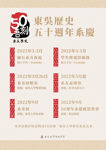 東吳大學建校122年歷史系系友回娘家「50吾刻,相聚時刻」,111年3月26日於外雙溪校區第二教學研究大樓6樓D615室舉行。20餘位師長及學長姊不畏風雨前來,細數與東吳歷史結緣的契機、草創時期的艱辛,以及學生時代的點點滴滴。期間校友總會劉吉人理事長、潘維大校長、董保城副校長,以及王淑芳社資長均到場向系友們致上最誠摯的問候,並祝福歷史系50周年系慶籌備順利、欣欣向榮。