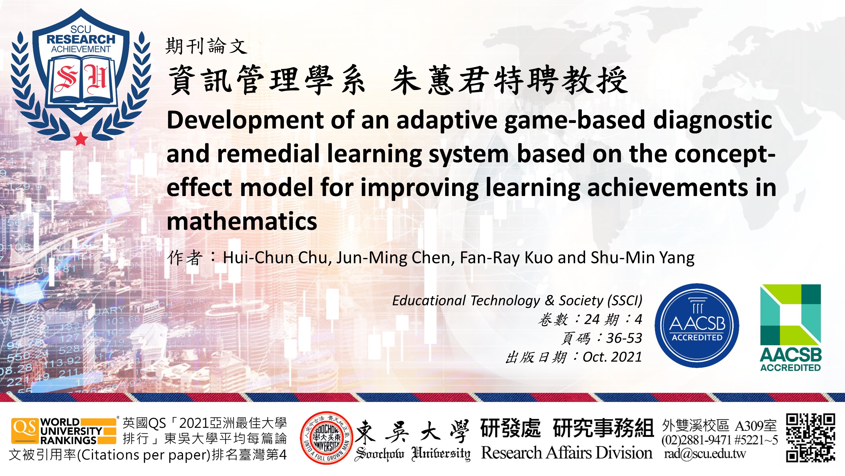 研究事務組提醒:教師如有最新發表於AHCI、SSCI、SCI、EI、TSSCI、THCI、「東吳大學外語學門獎勵名單」之期刊論文,歡迎將相關資訊e-mail至rad@scu.edu.tw,研究發展處將會公告於校園頭條,以廣交流。