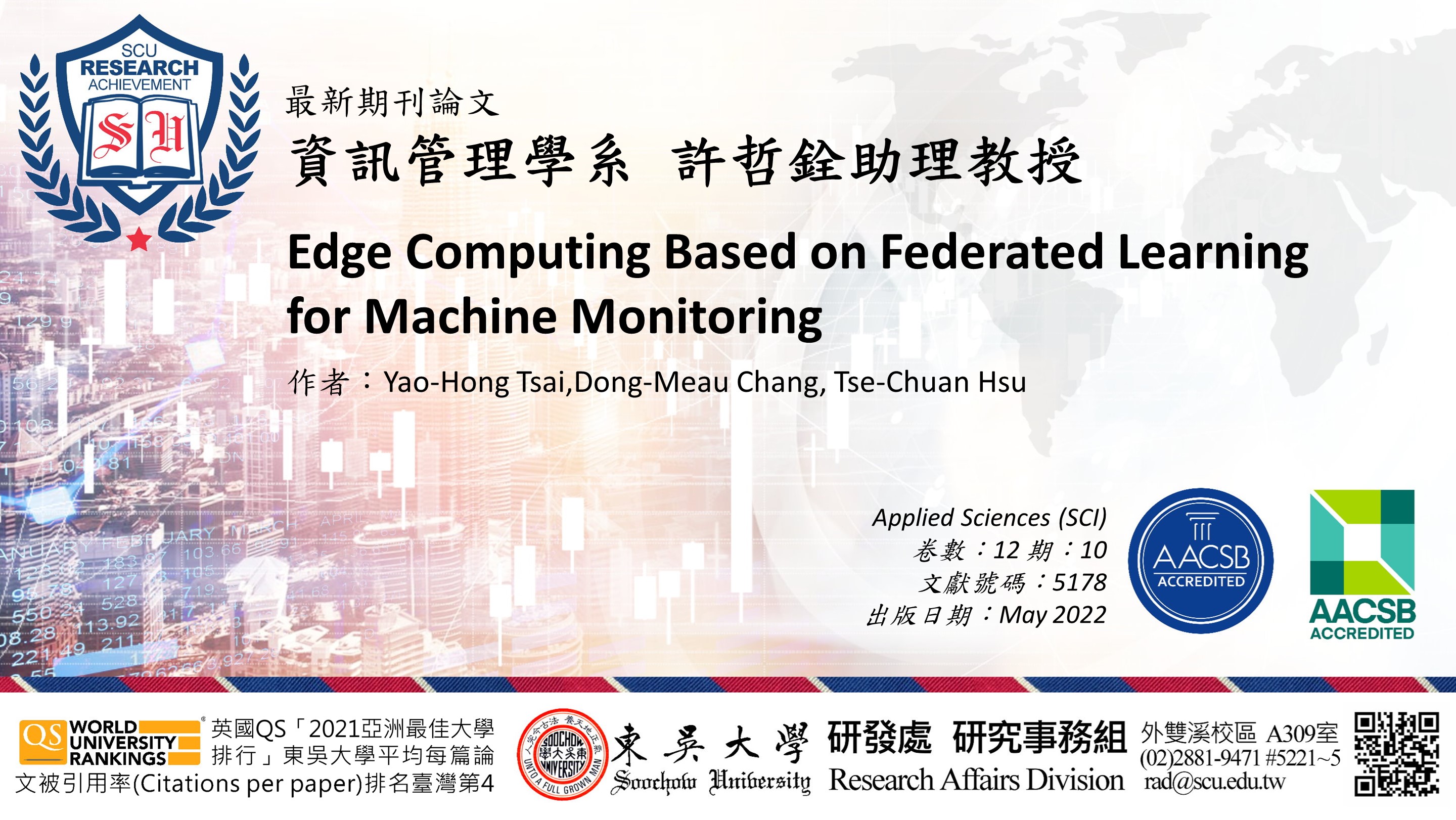 研究事務組提醒:教師如有最新發表於AHCI、SSCI、SCI、EI、TSSCI、THCI、「東吳大學外語學門獎勵名單」之期刊論文,歡迎將相關資訊e-mail至rad@scu.edu.tw,研究發展處將會公告於校園頭條,以廣交流。