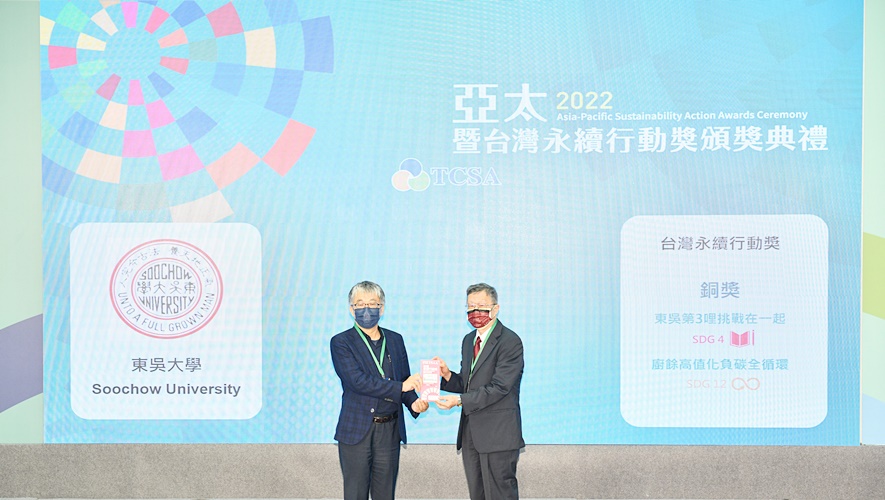 財團法人台灣永續能源研究基金會(TCSA)於111年8月12日假台北世貿一館舉行「2022亞太暨台灣永續行動獎」頒獎典禮。本校今年度以「東吳第3哩 挑戰在一起」及「廚餘高值化 負碳全循環」兩件行動方案榮獲「台灣永續行動獎」銅獎之肯定,並由趙維良副校長代表領獎。