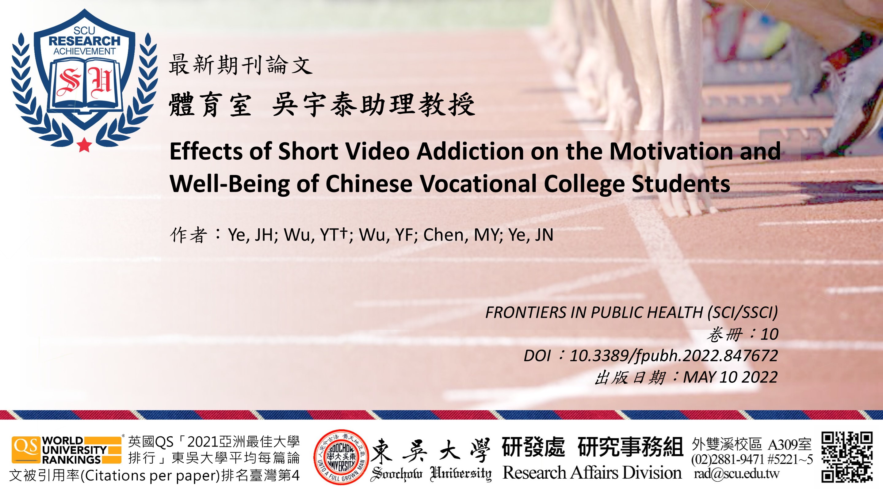 研究事務組提醒:教師如有最新發表於AHCI、SSCI、SCI、EI、TSSCI、THCI、「東吳大學外語學門獎勵名單」之期刊論文,歡迎將相關資訊e-mail至rad@scu.edu.tw,研究發展處將會公告於校園頭條,以廣交流。