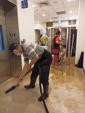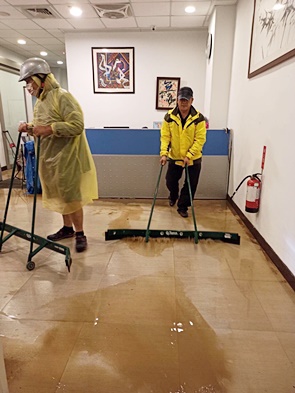 颱風尼莎挾帶豪雨,各地均傳出淹水和路樹倒塌災情,其中北部和東部災情甚為慘重。本校校園則是於10月16日傍晚於外雙溪校區A哨、網球場、第二教研大樓和圖書館行政區發生淹水狀況,幸賴校安中心、總務處、圖書館等單位緊急處理應變,晚間7點多當水位稍退後,事務組相庚祥副組長親自帶領同仁及工友先生們進行淤泥清除,齊心協力快速恢復校園各處景觀。