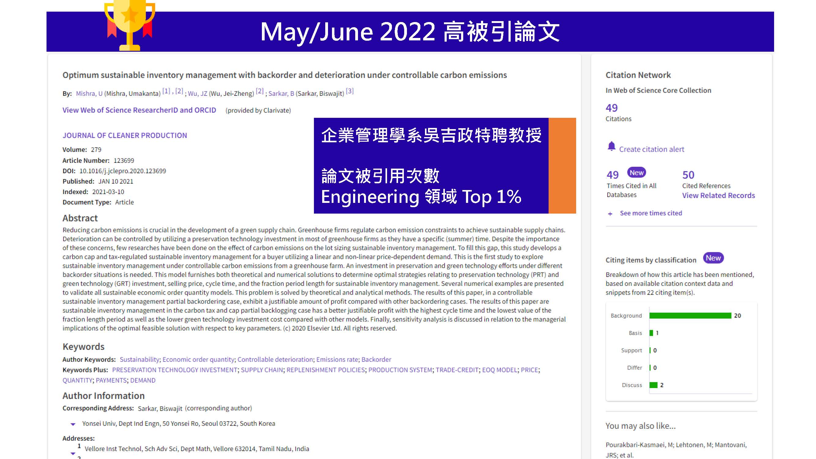 • 企業管理學系吳吉政特聘教授之論文被引用次數列入「Engineering」學術領域的前 1%,2020年合著:《A sustainable production-inventory model for a controllable carbon emissions rate under shortages》