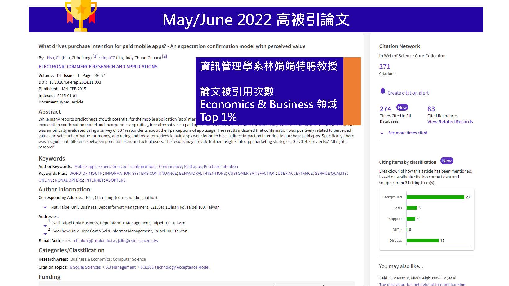 • 資訊管理學系林娟娟特聘教授之論文被引用次數列入「Economics & Business」學術領域的前 1%,2015年合著:《What drives purchase intention for paid mobile apps? - An expectation confirmation model with perceived value》