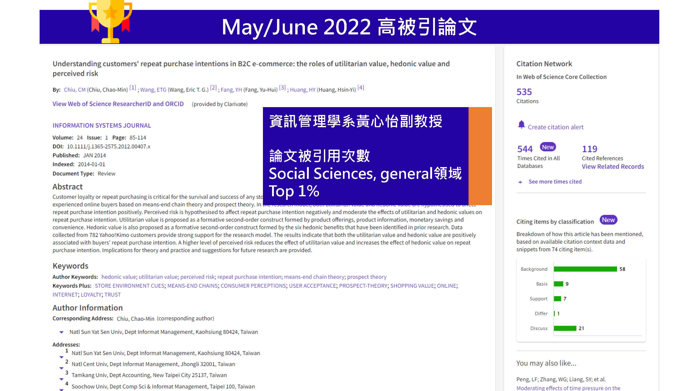 • 資訊管理學系黃心怡副教授之論文被引用次數列入「Social Sciences, general」學術領域的前 1%,2014年合著:《Understanding customers' repeat purchase intentions in B2C e-commerce: the roles of utilitarian value, hedonic value and perceived risk》