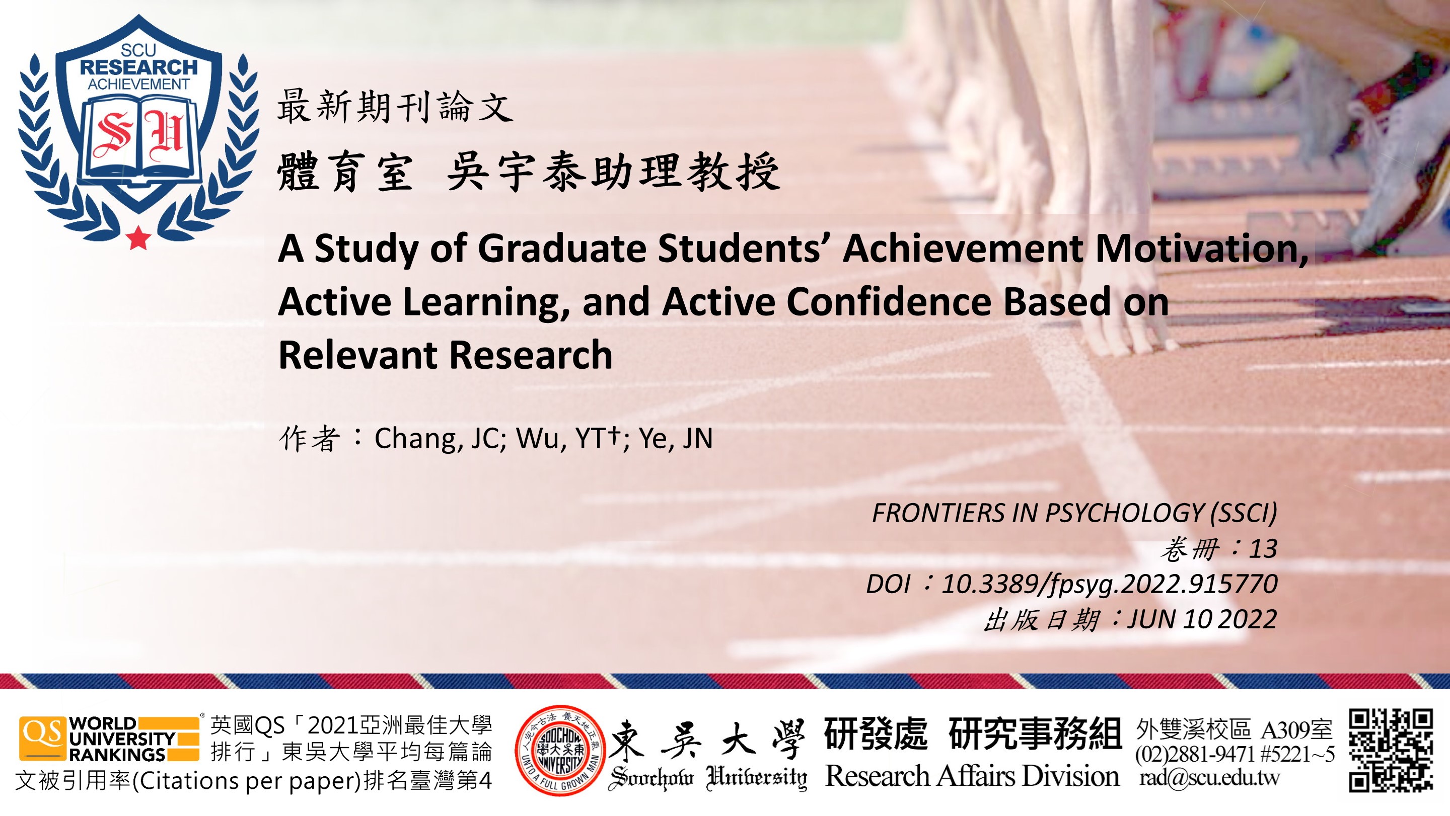 研究事務組提醒:教師如有最新發表於AHCI、SSCI、SCI、EI、TSSCI、THCI、「東吳大學外語學門獎勵名單」之期刊論文,歡迎將相關資訊e-mail至rad@scu.edu.tw,研究發展處將會公告於校園頭條,以廣交流。