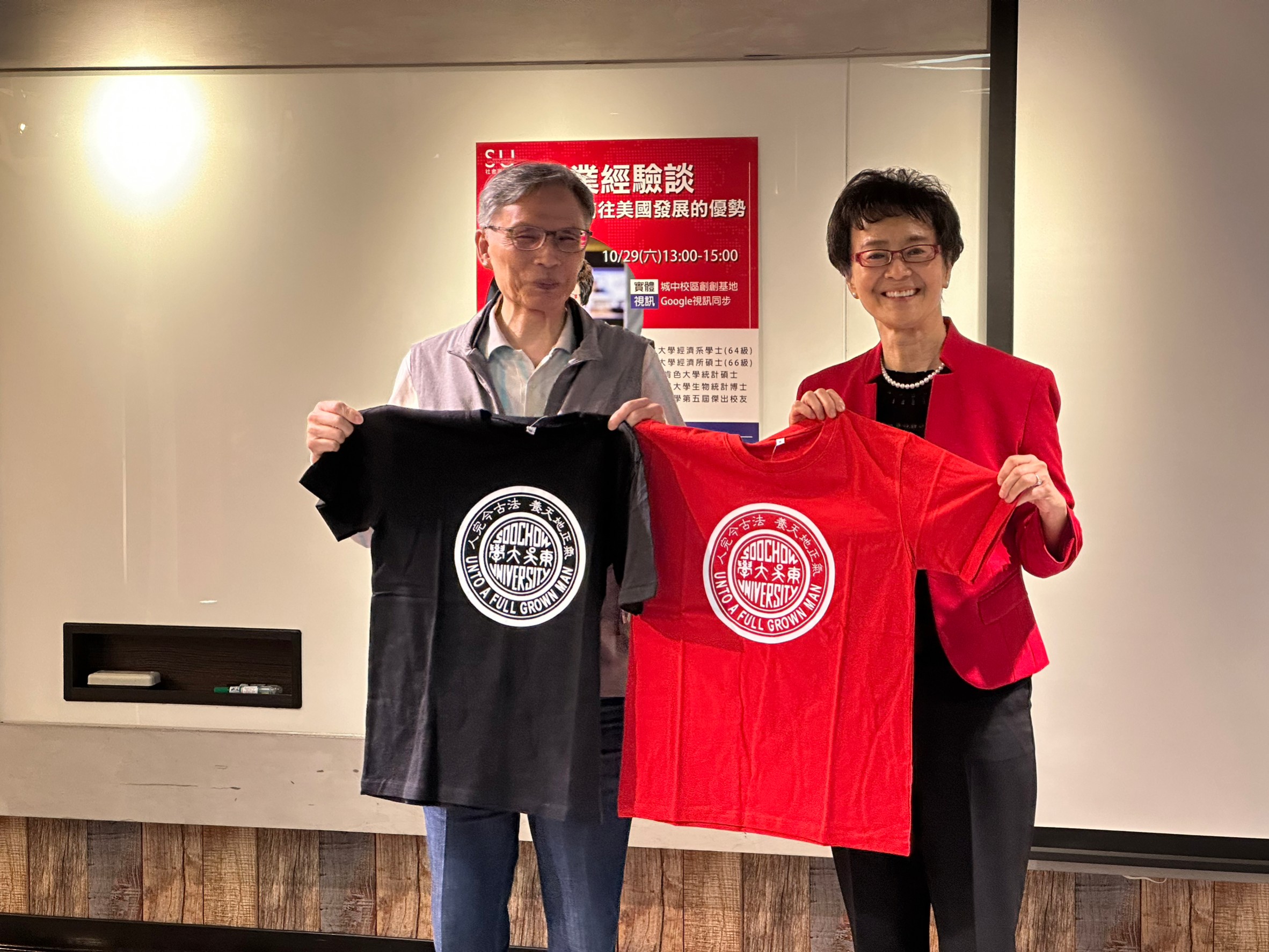 本校社會資源處於111年10月29日(六)在城中校區東吳實踐家創創基地舉辦「創業經驗談及臺灣青年前往美國發展的優勢」講座,邀請年初甫榮獲美國「白宮終身成就獎」,以及同時是本校第5屆傑出校友白越珠學姐(經濟系64級)返校蒞臨分享。