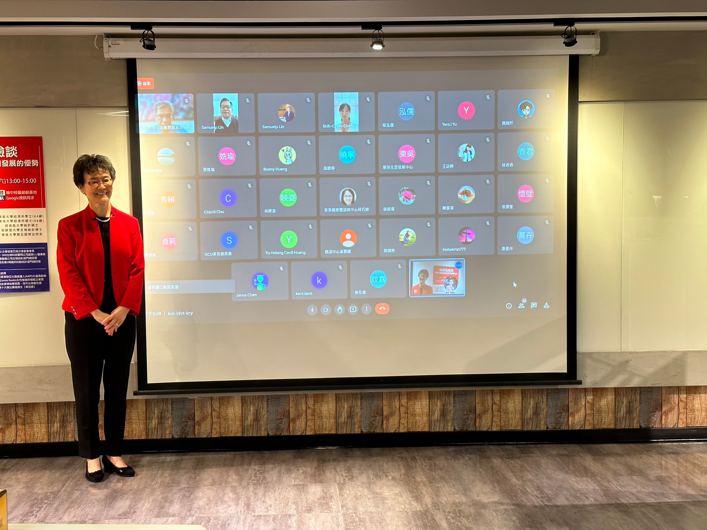 當日活動,本校潘維大校長(法律系69級)、董保城副校長(法律系65級)、王淑芳總務長(政治系76級)、姚淑文社會資源長、商學院阮金祥院長、校友總會陳惠貴理事長(財精系75級)、東吳傑英會林鵬良理事長(英文系66級)、陳調鋌學長(數學系65級)、劉忠賢學長(企管系66級);FOS東吳之友基金會董事陳鳳桃學姐(經濟系72級)、唐孝先學長(企管系73級)、陳思如學姐(政治系93級)等人以及線上參與的學生、校友們皆共襄盛舉出席或線上聆聽。潘維大校長致詞時表示,越珠學姐以一位華裔女性的身分,隻身赴美國發展著實不易,且當時美國對其他族群不友善,學姐憑藉著個人優異的表現,不僅創業成功,多年來獲獎無數,榮獲多項肯定,值得我們學習。而人在美國的東吳傑英會林鵬良理事長,也特地上線致詞,感謝學姐的在專業領域的貢獻,以及服務社區、回饋社會的愛心與努力!