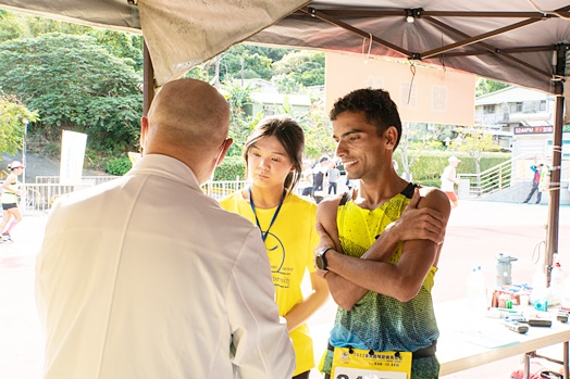 「渴了再喝就來不及啦!」高醫師強調,除了能量補給外,對於選手而言更重要的是充足的水分與鹽分。在比賽開始前,超馬醫療團隊都會為每位選手測量體重;比賽途中也會每隔四小時固定紀錄選手體重變化,若發現有體重減少超過5%的情形時,高醫師與醫療志工便會在場邊提醒選手注意水分的補充。然而,高醫師補充說道水分與鹽分的平衡很重要!水分不足會引發中暑、姿勢性低血壓等症狀,最嚴重者甚至會造成意識不清及心跳停止。而喝過多水反而會造成體內鹽分過低,導致痙攣及低血鈉的病狀。因此,他建議要計畫性的補水,並隨時注意鹽分的攝取量,降低生理風險,有益場上的發揮,更能有效減緩賽後的不良症狀。
