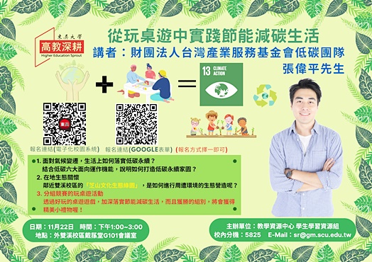 本校學生學習資源組與財團法人台灣產業服務基金會合作,於111年11月22日在外雙溪校區G101會議室辦理「從玩桌遊中實踐節能減碳生活」講座,張偉平講師分享內容以「氣候變遷」和「2050淨零排放目標」做為切入點引導,說明如何從個人落實淨零願景和減碳生活。