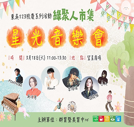 東吳大學建校123年校慶典禮暨運動大會,將於112年3月18日在外雙溪校區盛大舉行。本次校慶群育暨美育中心舉辦「綠聚人市集」號召社團擺台,提供美食、音樂表演及永續主題活動,邀請大家響應環保,而「星光音樂會」則邀請閻奕格、吳汶芳、HowZ等多位人氣歌手獻唱,卡司陣容堅強。眾多活動期待吸引更多學生、校友回母校,也呼應本次的校慶主題「正氣永流傳」精神,讓東吳人團圓,齊聚母校慶生。