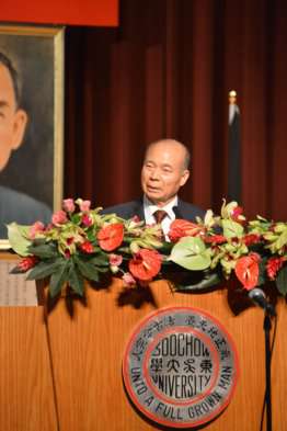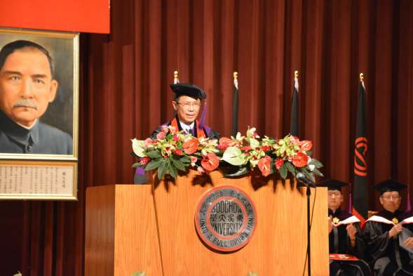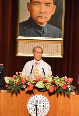 東吳大學校友總會榮譽理事長唐松章代表10多萬東吳校友,歡迎畢業生踏入社會,唐松章說,道德與仁愛是立國根本,法律與觀念要與時俱進,期許法學院畢業生以校訓精神「養天地正氣,法古今完人」提醒自己,要培養善良心胸,公平公正地執行法律,避免成為恐龍法官。