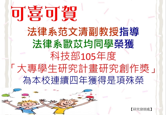 科技部日前公布105年度大專學生研究計畫研究創作獎獲獎人員名單,本校共計4位學士班學生經評審計畫成果優良且具創意而獲獎,已是本校師生連續4年榮獲此獎項肯定。該獎項每年獲獎人數以全國200名為限,獎金新台幣貳萬元及獎狀一紙,並頒發獎牌一座予指導教授,以資表揚。