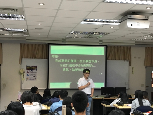 在有了夢想後,要懂得正面看待人生,多走出去看看,不一定要有很多很多的錢。但轉變態度,積極看待自己。老師在最後,要分享了許多關於自己學生的故事,從一個家中欠債顛沛流離的人,變成一個外商公司高階主管。從一個小女生,變成空姐。最後老師送給各位的一句話,「完成夢想的價值不在於夢想本身,而在於過程中你所展現了勇氣、執著和意志力」。