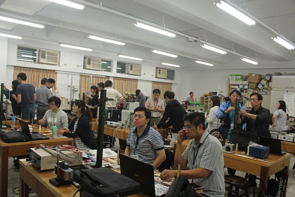 說是研討會,其實「實作工作坊」才是重頭戲。工作坊有張有毅老師「使用arduion 打造自己的實驗範例:量測重力加速度g」、齊祖康老師的「如何準確的測量質心轉動慣量:應用至單擺週期探究教學」、梅長生老師的「互動式教學的探究與實作課堂分享:以PBL、ZuVio、Moocs為例」,另外兩場動手玩地震,由中央研究院地球科學所梁文宗老師:手做地震儀的基本物理,台灣師範大學地球科學系陳卉瑄老師:由地震波探知地球內部」。