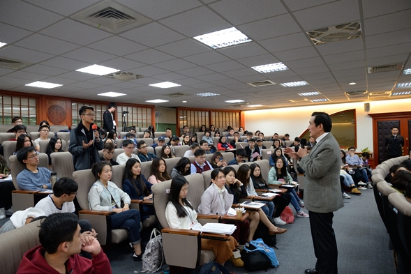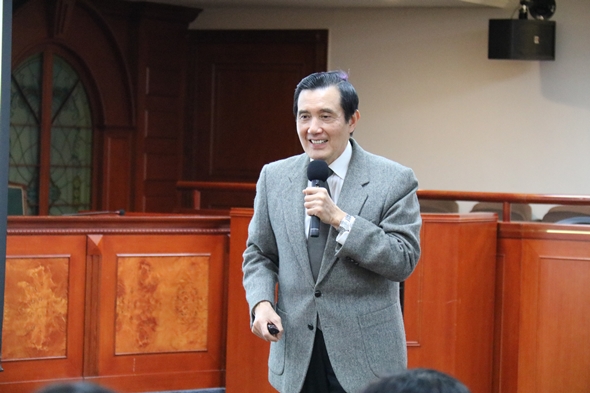本校自105學年度起禮聘前總統馬英九先生以榮譽無給職方式擔任「嚴家淦法學講座教授」,以每月1場不同主題的演講課程,與本校同學互動對談,2018年的第1場演講「兩岸關係與國際法(二):九二共識的來龍去脈」於1月3日上午在本校城中校區崇基樓實習法庭開講,本校師生踴躍報名,熱情參與,現場一位難求。