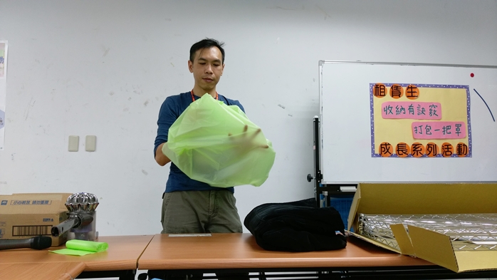 常常覺得東西太多,住宿空間不敷使用?為了讓租賃生在外住得更有品質,學生住宿中心於106年11月30日在本校外雙溪校區舉辦「收納有訣竅,打包有訣竅」的演講活動,並邀請特力屋專案規畫師陳書錦,與同學分享厚重衣物、棉被該如何簡單收納,如何正確組裝和保養鍍鉻架,期許在分享後,都能讓同學在外住宿的第二個家變得更加舒適。