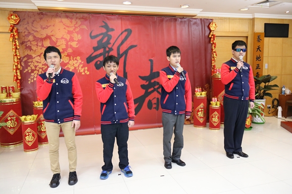 本次特別邀請由資源教室四位視障同學,中文系沈柏鴻、中文系謝少青、法律系王士朋、英文系羅文謙所組成的「東吳四海遊龍」進行表演,共帶來四首動人的歌曲,首先演唱的是能真切表達他們心情的歌曲-蕭煌奇「你是我的眼」,雖然看不見卻可以真實感受師長及同學的關懷。接著演唱「逆風飛翔」及「風中的羽翼」,真誠且富有感情的歌聲感動眾人,更帶來正能量。最後一首歌曲則邀請現場師長同仁大合唱「我的未來不是夢」,嘹亮的歌聲激勵大家追求夢想永不放棄,齊心協力讓東吳大學發光發熱。