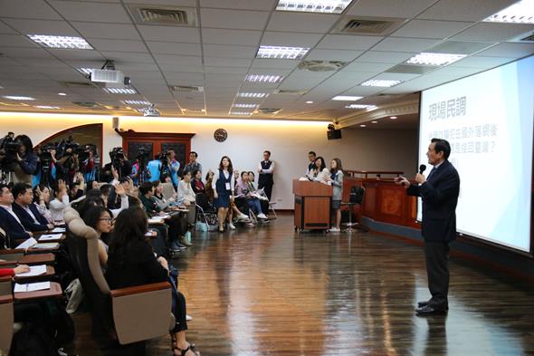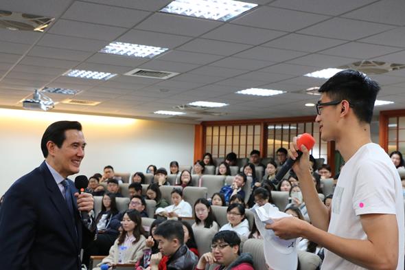 最後,現場同學們踴躍向馬教授提問,其中有位陸生同學詢問馬教授對近期習近平主席修憲的看法,引起現場師生會心一笑,而馬教授則反問她對於是否同意習主席繼續連任下去?同學則回應認為每種制度存在都有合理性和必然性,不可否認的是一黨專制的情況下,大陸經濟和建設上的確有許多提升和進步,對於她的回應,馬教授十分誇讚其對於國際政治的瞭解。每次馬英九教授的演講課程總是吸引許多師生前來一睹風采,而令人期待的提問時間,幽默風趣的馬老師帶領師生們一同腦力激盪,同學們紛紛表示意猶未盡,翹首以待下一次的課程。