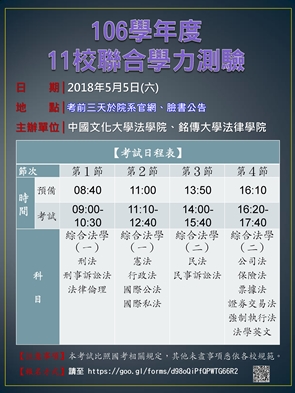 國考是每個法政學門畢業生、在校生難免必需面對的人生試煉,縱然考場如戰場,準備過程更是條漫長且孤獨的路,儘管艱辛,也還有這麼多戰友並肩奮鬥。何不用一場場試煉更加肯定向來的努力!讓我們勇敢在2018年5月5日(星期六)先試筆、試身手~接著試試如意。
