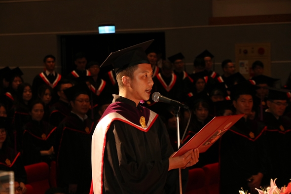 典禮中,法學院博士班黃鼎軒同學代表畢業生上臺致詞時說,法律人常背負著眾人的期待與目光,但其背後的努力卻是很難被看見,讓法律系畢業生們都深有同感。而他也提到,令他印象深刻的社會議題「小燈泡事件」中受害人父母聲明稿的一句話「生命本身沒有意義,是人賦予生命意義,何嘗司法程序本身不是沒有意義,是人賦予它意義」與畢業同學們共勉之。