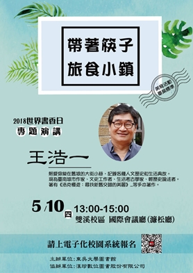 深入大城小鎮的街巷,記錄每一道台灣小吃的樣貌、滋味,享受每樣美食背後的故事,107年5月10日由圖書館主辦的世界書香日專題演講在國際會議廳舉行,邀請生活考古學家王浩一老師,分享在台灣探索的巷弄美食,並且帶領大家一同進入各鄉鎮中,以旅行、吃美食的方式逛生活。