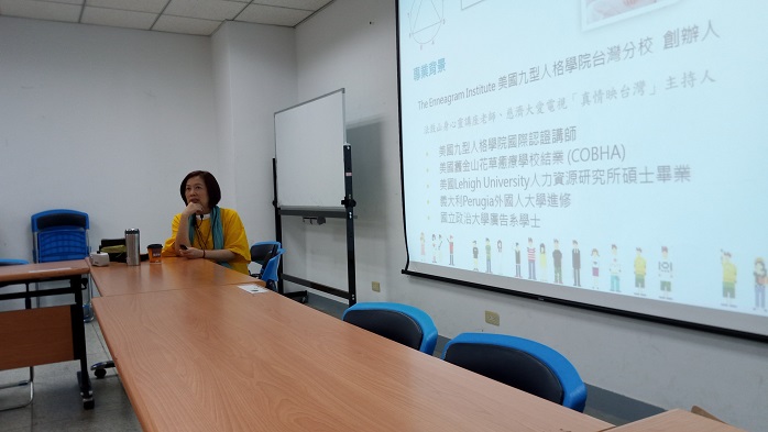 美國九型人格學院台灣分會執行長胡挹芬老師為本次活動的講師。她提及自己學習九型人格的經驗,也分享九型人格是一門結合古老神祕智慧與現代心理學分析方法的自我分析工具。九型人格分析備受矚目的原因是它相當地精準,因此可以廣泛應用在親子家庭、職場和教育等等,所以只要善用人性地圖,「邊學、邊做、邊調整」,就能掌握交際的主動權。