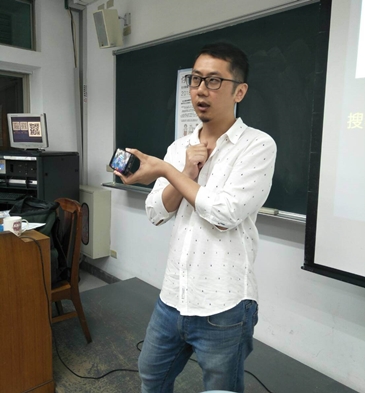 楊老師簡單地介紹所謂的「AR擴增實境」就是指將虛擬影像疊加於實體物件,透過媒介呈現出來;「VR虛擬實境」則是利用電腦模擬產生一個三維空間的虛擬世界,提供使用者關於視覺等感官的模擬,讓使用者感覺身歷其境。楊老師說這些技術常常被拿來應用在電影、藝術、書本及遊戲方面上。比如說最近剛上映的《毀滅大作戰》,在電影宣傳期間,為了要讓民眾可以感受到巨獸的震撼,還加入了「AR擴增實境」的元素,使大家可以親身體驗當下的刺激感。甚至在美國的電影播放前,結合預告片和AR遊戲,讓觀眾能夠互動贏得爆米花優惠卷,增加不少看電影的樂趣。
