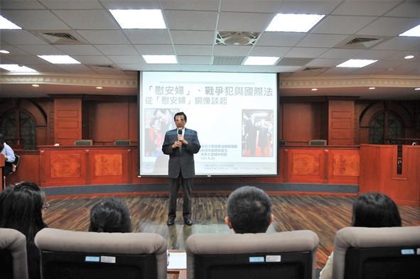 東吳大學自105學年度起禮聘前總統馬英九先生以榮譽無給職方式擔任「嚴家淦法學講座教授」,以每月1場不同主題的演講課程,與本校同學互動對談。馬英九講座教授本學期的第1場演講以「『慰安婦』、戰爭犯與國際法—從『慰安婦』銅像談起」為題,於9月26日上午在本校城中校區實習法庭開講,校內師生報名踴躍熱情參與,現場座無虛席。