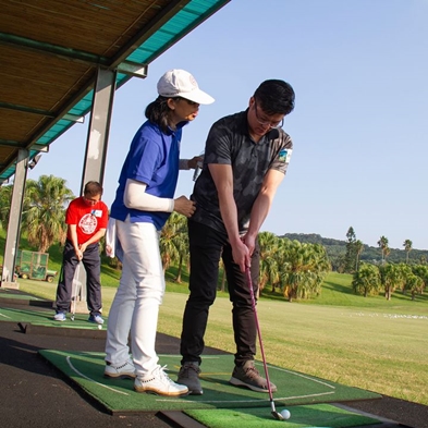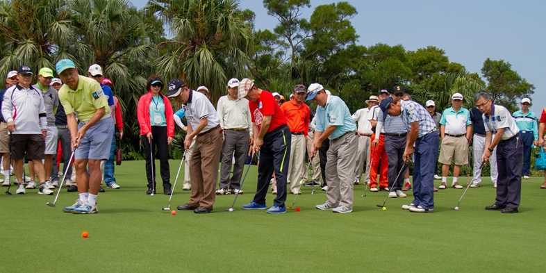 揮別陰雨連綿的日子,迎接大家是一片萬里晴空,12位開球嘉賓也為活動揭開序幕!將6種顏色的高爾夫球接力推進球洞,當球緩緩推進球洞,象徵各地區校友們再次齊聚一堂,體現出「走遍天下,心繫東吳」的溫暖情懷。為增加揮桿動力,除設有一桿進洞獎外還設有遠距獎。另外,為了推廣高爾夫運動,今年特別專為新手推出教學方案,由東吳大學體育室譚彥老師親自上場,在練習場上指導剛接觸高爾夫球的學長姐們高爾夫技巧,從基本站姿,重心擺放,握桿方法,進而瞄準揮桿,循序漸進,讓沒有經驗的校友亦能享受揮桿樂趣。